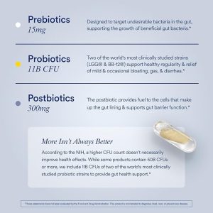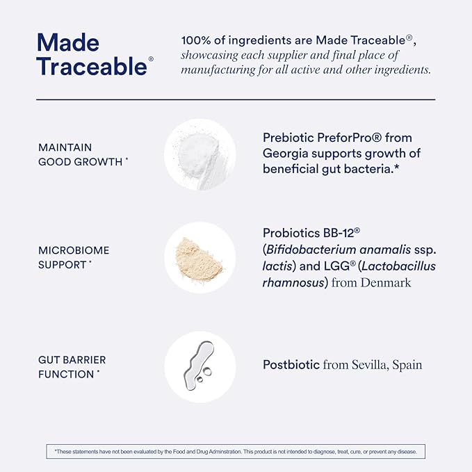 • SYNBIOTIC+ 3-IN-1 FORMULA: with prebiotics, probiotics and postbiotics to support a balanced gut microbiome. Our formula is Made Traceable with 11b CFUs with two of the world’s most clinically studied probiotic strains. Our visible supply chain tells you what you’re putting into your body where it comes from and why. Plus it’s designed to thrive with our delayed-release capsule to help reach the colon (not the stomach), an ideal place for probiotics to survive and grow.